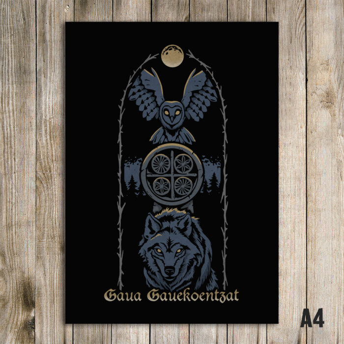 Gaueko izaki mitikoa, otsoa eta hontzaren irudipean, hilarri bat inguratuz.